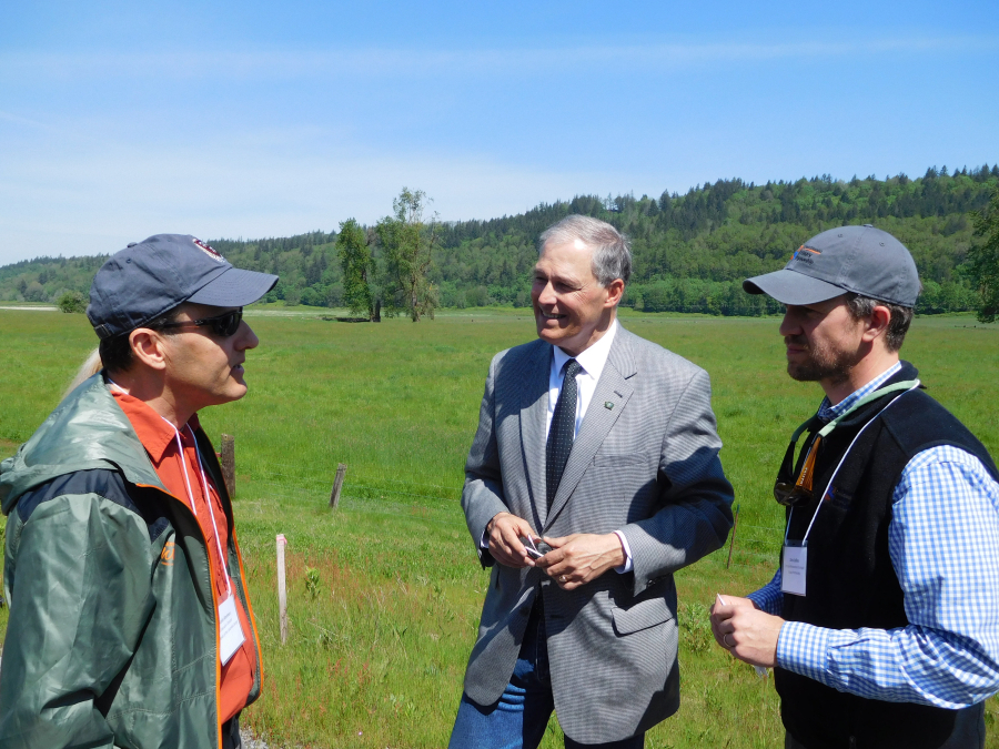 Washington Gov. Jay Inslee participated in a driving tour Tuesday morning on the levee above the Steigerwald Lake National Wildlife Refuge to learn about a $22 million habitat restoration and flood-control project expected to create more than 440 temporary jobs.