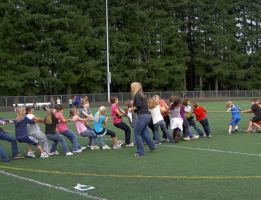 Students were given time to visit four stations, which were designed to promote educational goals. They included catapult competitions, soccer goal kicks, tug-of-war, jogging and yoga stretching. Parent volunteers from the Parents Association of Lacamas Students manned the stations.