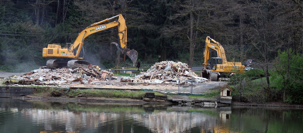 The building that previously housed the Moose Lodge was demolished Monday morning by City of Camas crews to make way for the new Lacamas Lake Lodge and Conference Center. The city’s $1.9 million project includes a new 5,000 square foot building that will consist of a large event space, two smaller meeting rooms, office space, kitchen, restrooms, storage, large covered patio and a 60-foot long dock. Construction is expected to get underway in June, and be completed in early 2014. “It went very quickly,” Public Works Director Eric Levison told the Camas City Council on Monday. “By 9 a.m. it was almost a pile of rubble. The concrete will be removed tomorrow. It will be a clean site and ready for our contractor to build a new facility.”