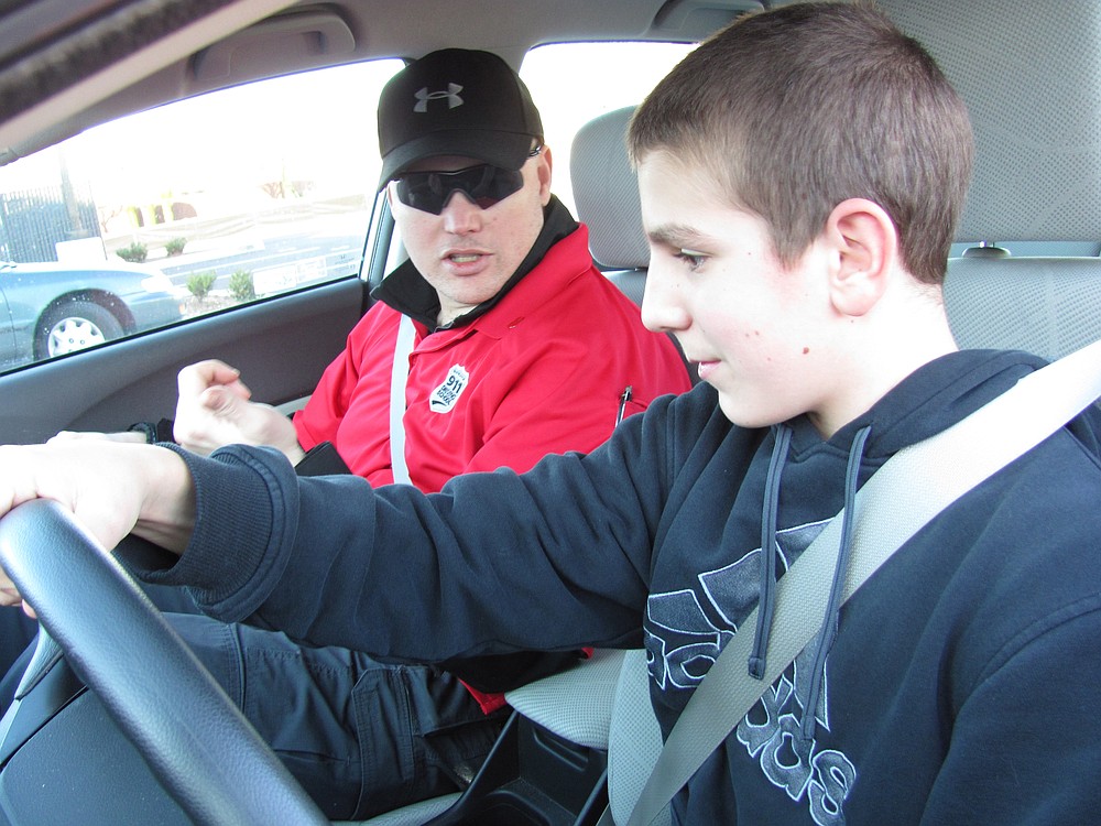 Geary Enbody, an instructor with the 9-1-1 Driving School in the 192nd Avenue Station, talks to Washougal High School freshman Brody Oberg. Enbody, an officer with the Woodland Police Department, is among the law enforcement personnel who serve as knowledge/skills examiners. The driving school provides teen drivers safety education and certification courses, medical assessment drives and programs for mature drivers.