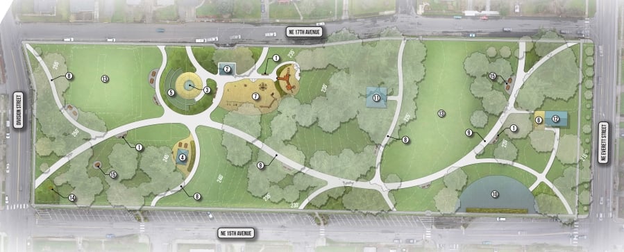 On the “Option 1” illustration, the park’s nearly 65-year-old swimming pool — the only outdoor public pool in Clark County — has been replaced by a newer pool, but remains a major feature in the 7.3-acre Crown Park.