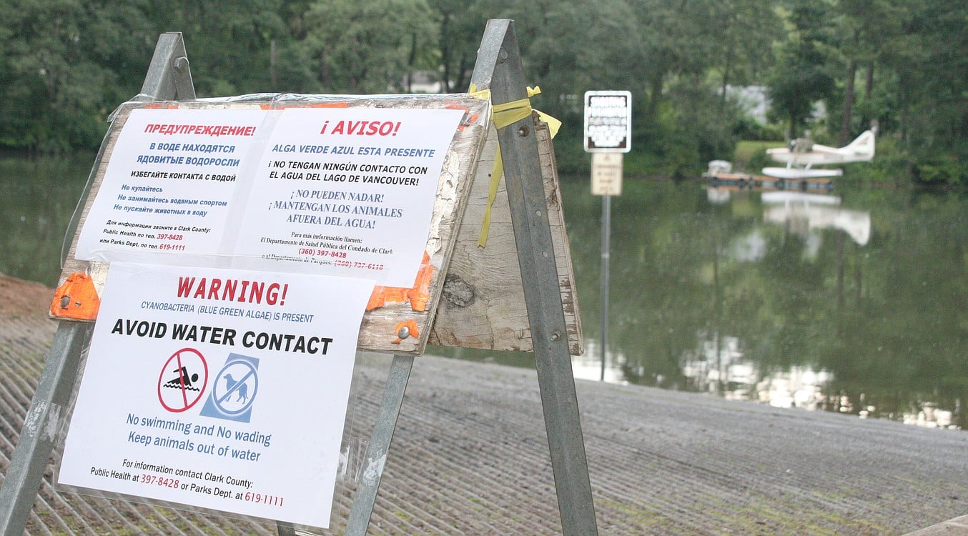 Caution signs remain posted at Vancouver Lake due to blue-green algae blooms.