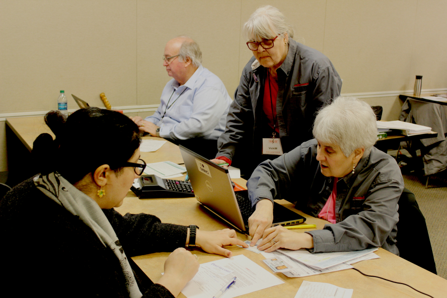 Local AARP Foundation Tax-Aide coordinator Sherry Davis (right) inspects documents provided by taxpayer Nadia Samiee (left) of Vancouver at the Camas Public Library in February 2019, while Tax-Aide counselor Vicki Millard (second from right), of Washougal, watches and Tax-Aide counselor Mike Leonardich (third from right), of Vancouver, works on another tax return. (Post-Record file photo)