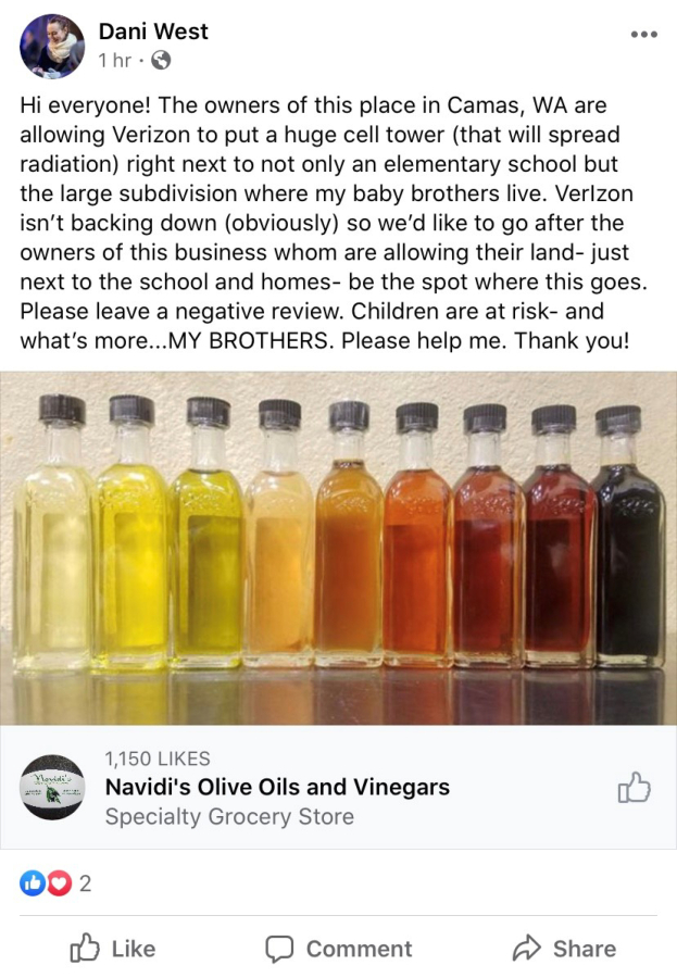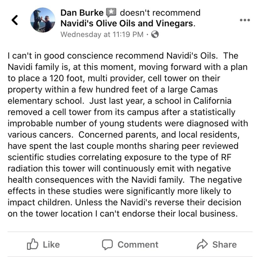 A downtown Camas business became the target of an online “negative review” campaign this week after a small group of local residents decided to get personal with their efforts to move a proposed cell tower away from a local elementary school.