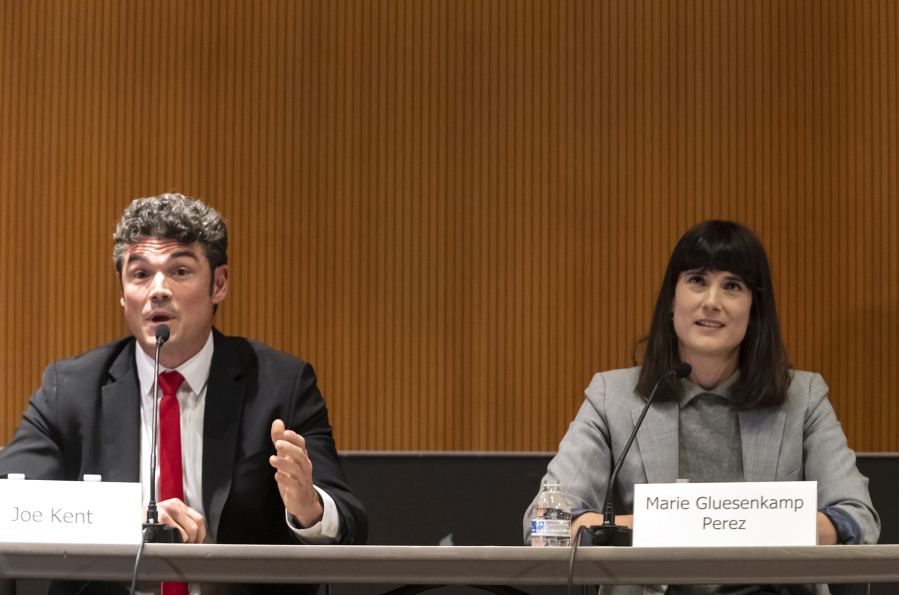 Democratic candidate Marie Gluesenkamp Perez, of Washougal, runs an automotive shop with her husband in Skamania County, earned a bachelor’s degree in economics from Portland’s Reed College, has held elected positions within the Democratic National Committee and the Underwood Soil and Water Conservation District Board of Supervisors and was the executive director of the Stevenson Downtown Association.